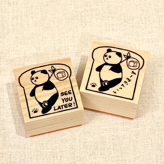 パンダのはんこ / panda stamp メープル台木 / maple wood 3cm✖️3cm 日本語か英語かお好きな方をお選びください Please choose which one you would like, Japanese or English! 好きなパンをもってお出かけするパンダ Panda going out with his favorite bread